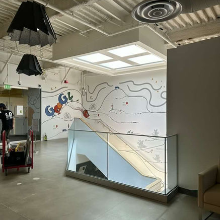 For Google's San Diego based office, the following is a painted mural that incorporates dimensional signage, a textural sun, and use of rope to define the mountain ridge. The design was inspired by a seuss themed floor within the building, while also using animals and conference room names to tie in elements from other floors.
